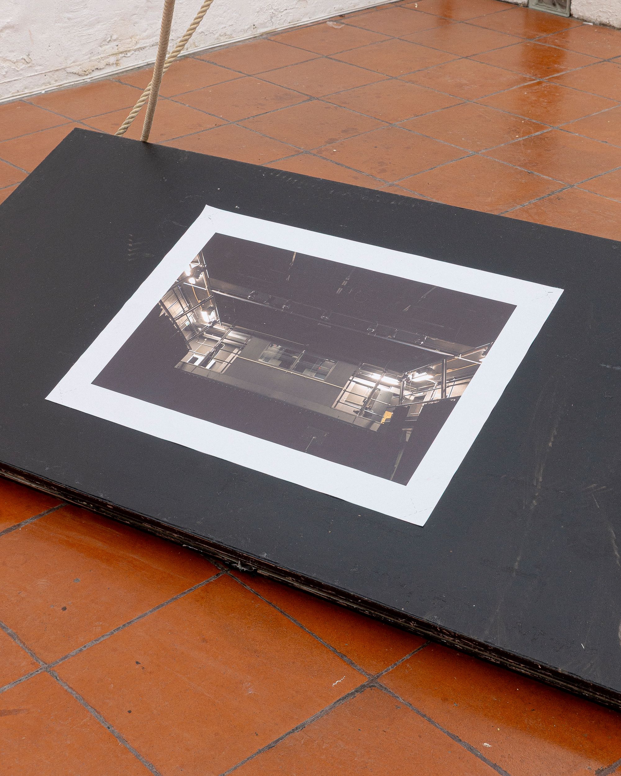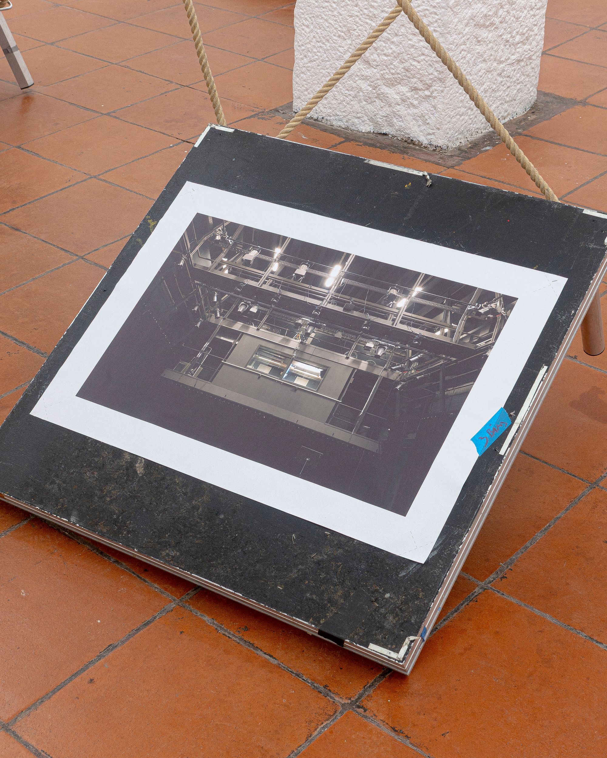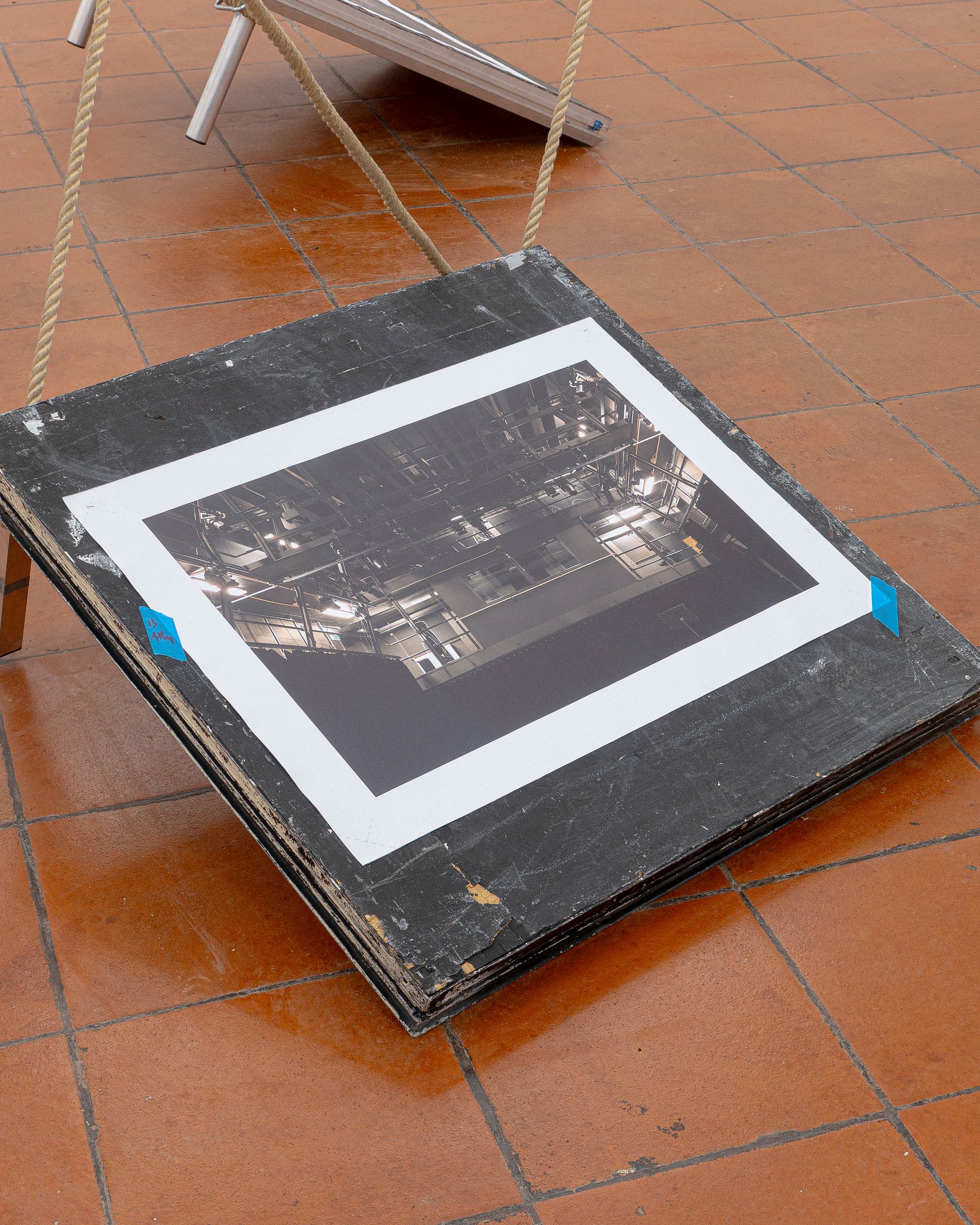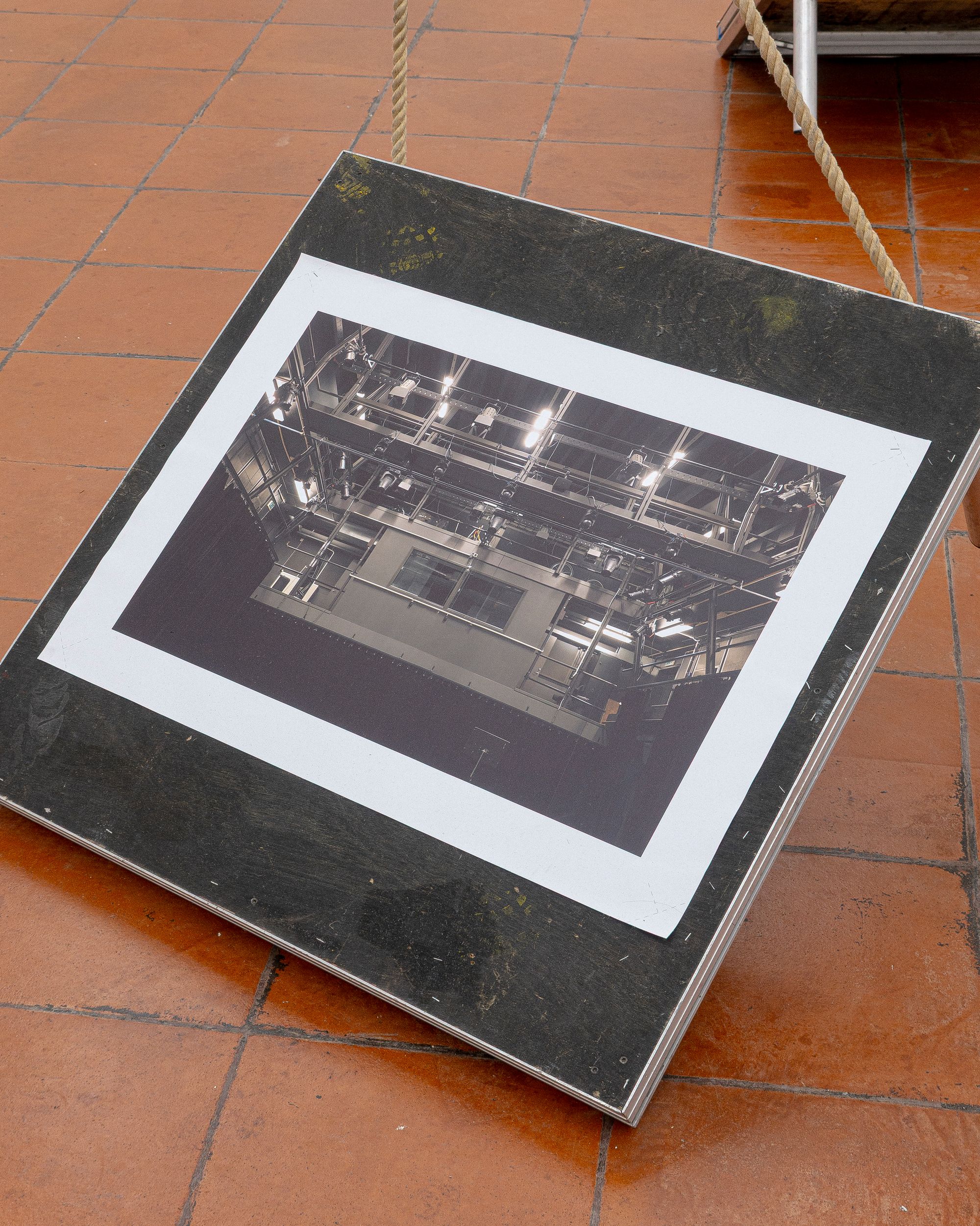 Theatre rope and photographs (inkjet on canvas) on stage elements