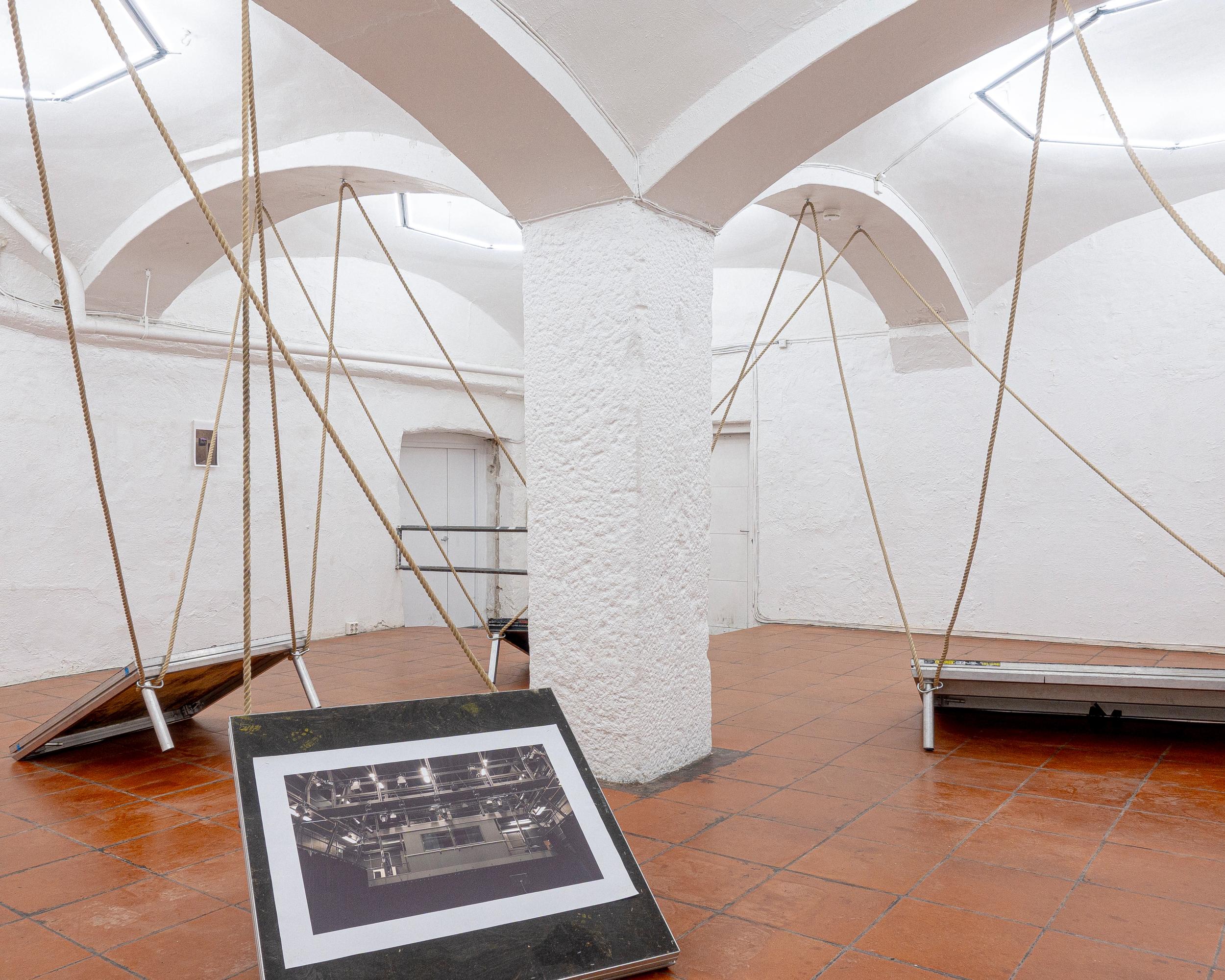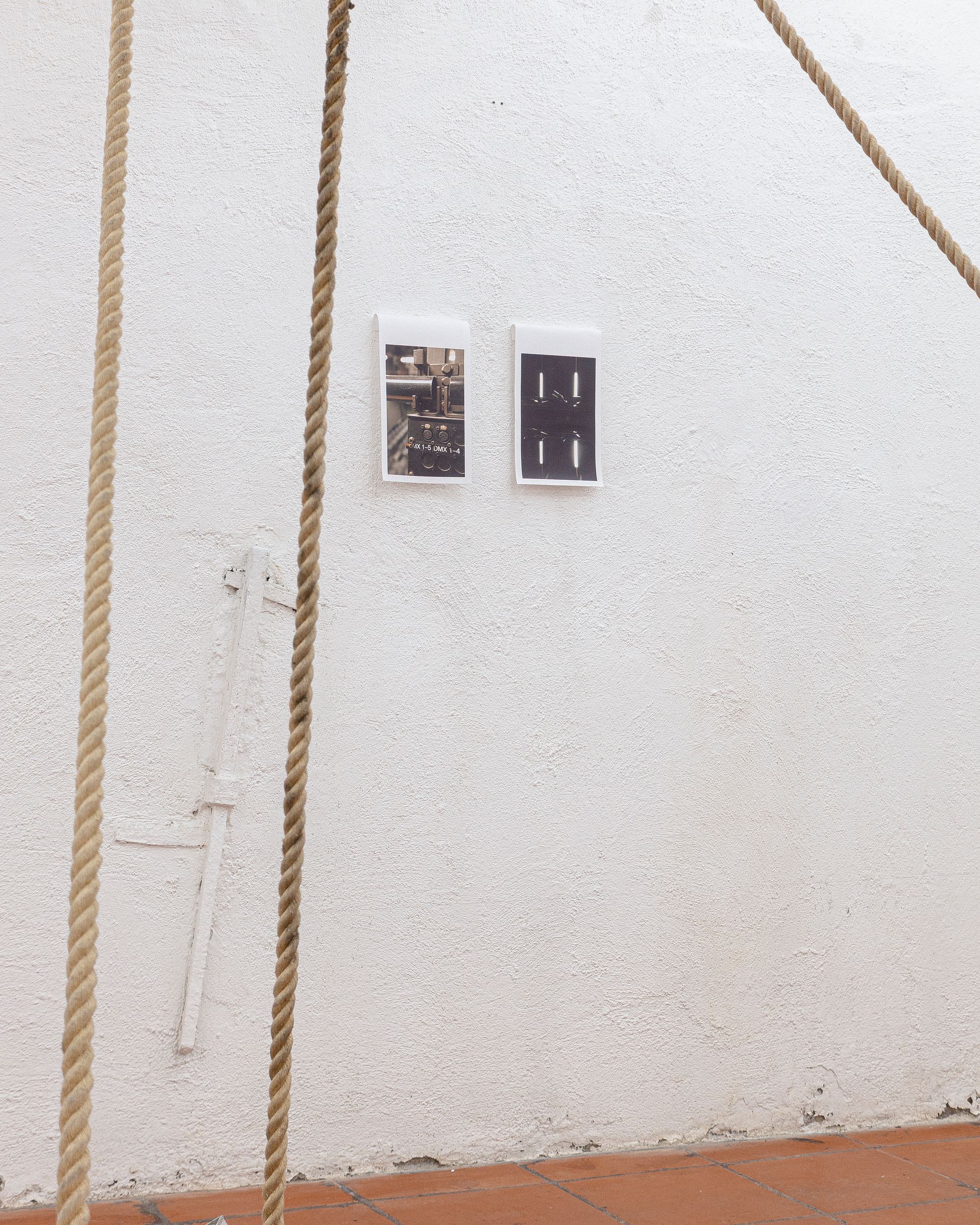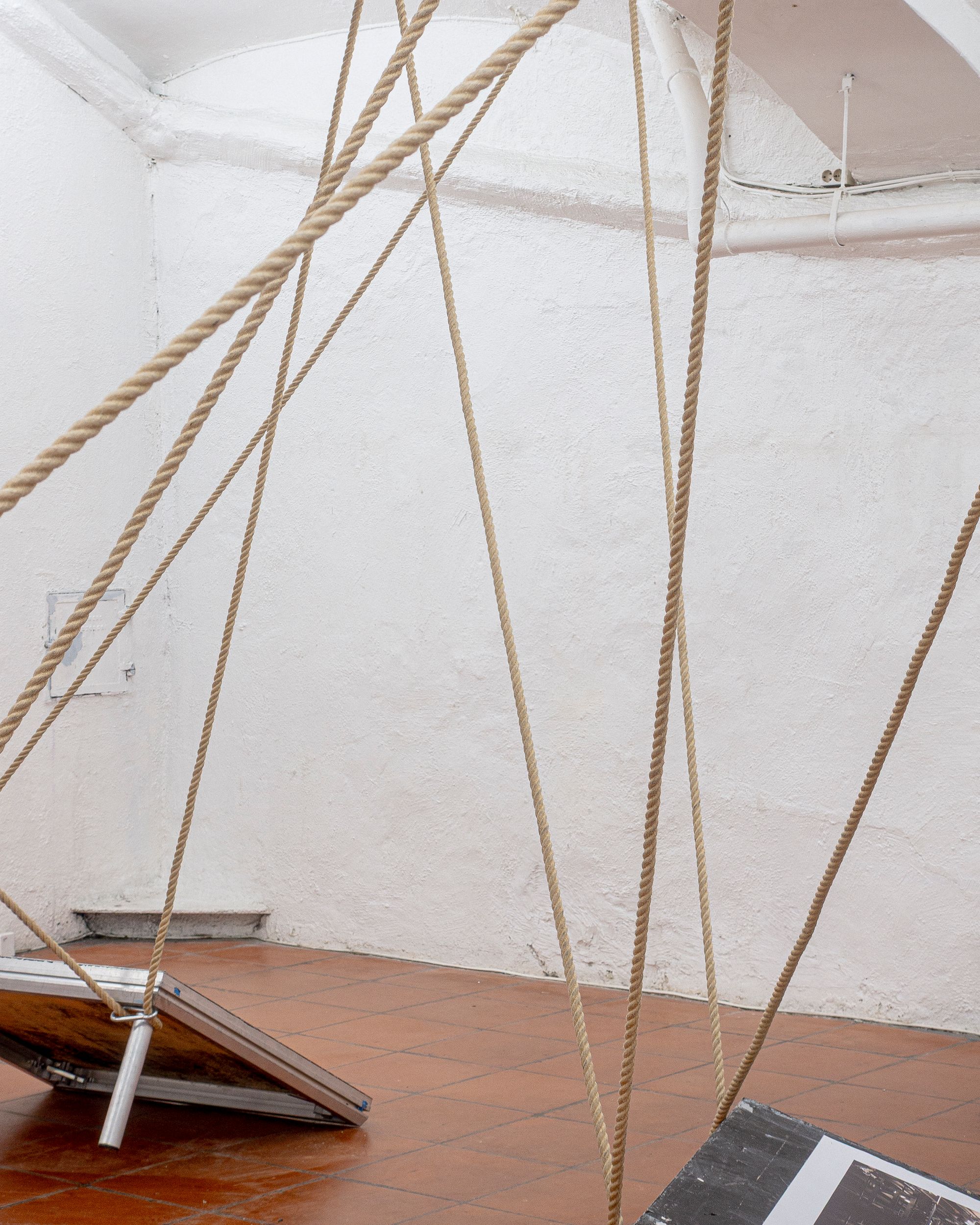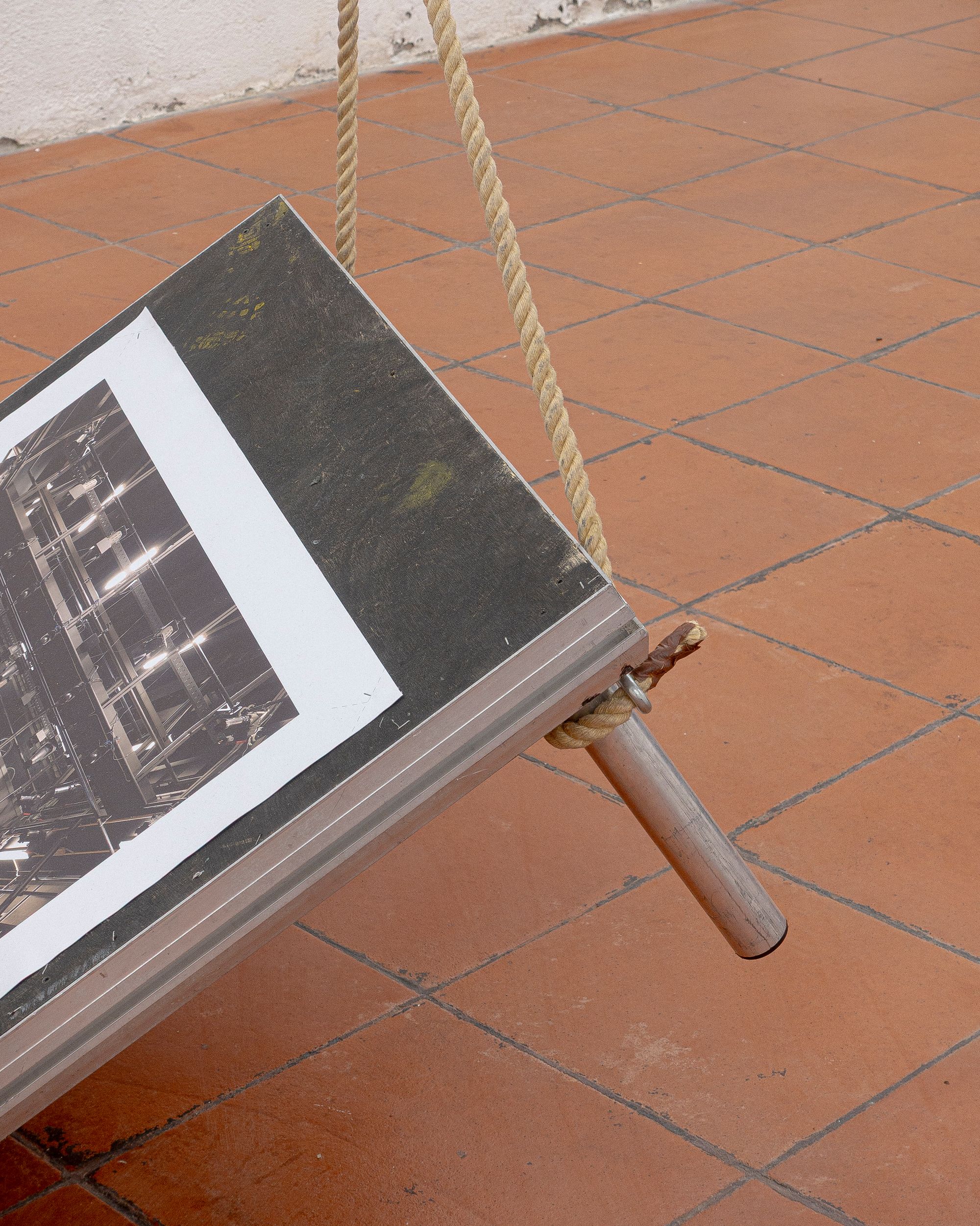 Theatre rope and photographs (inkjet on canvas) on stage elements