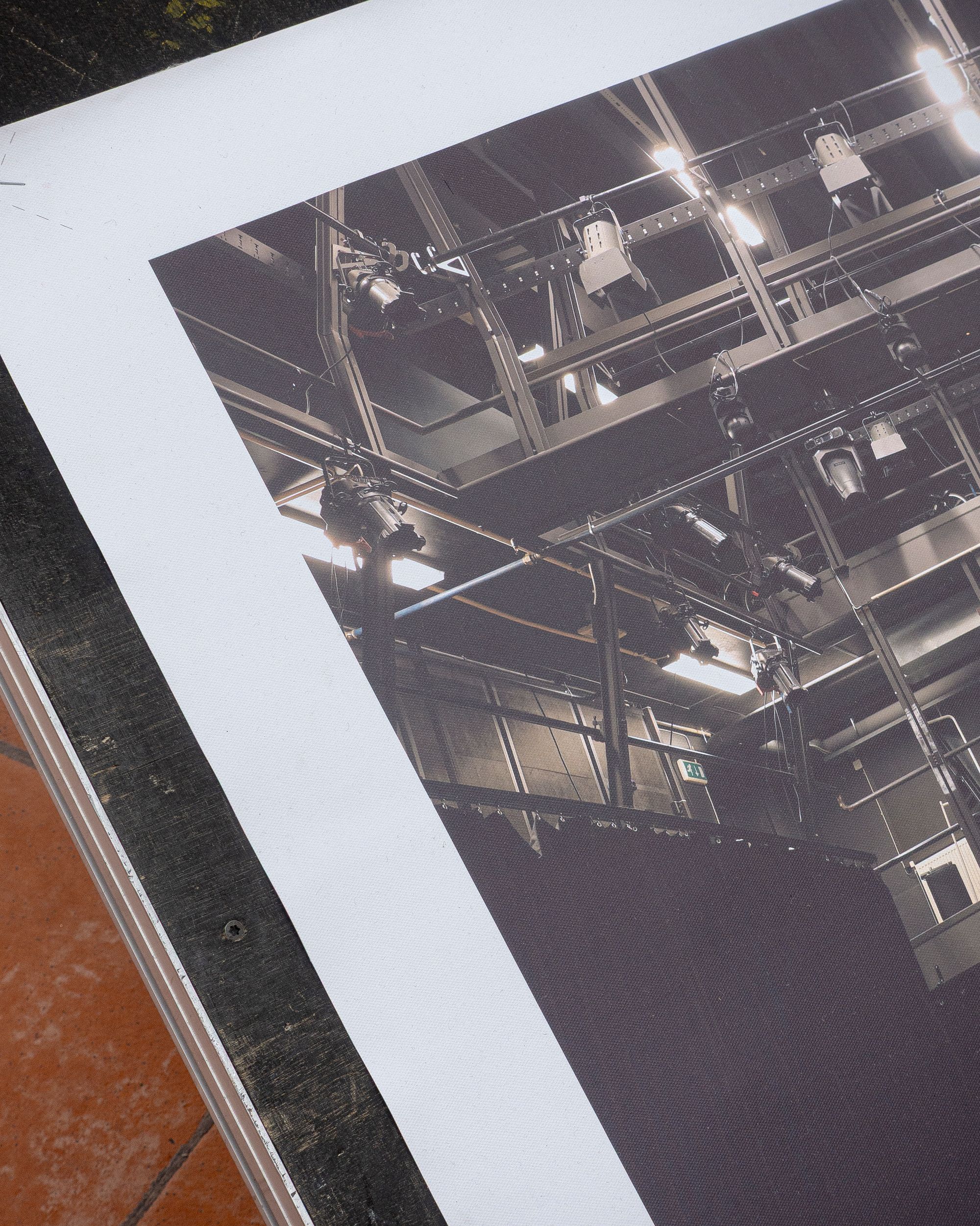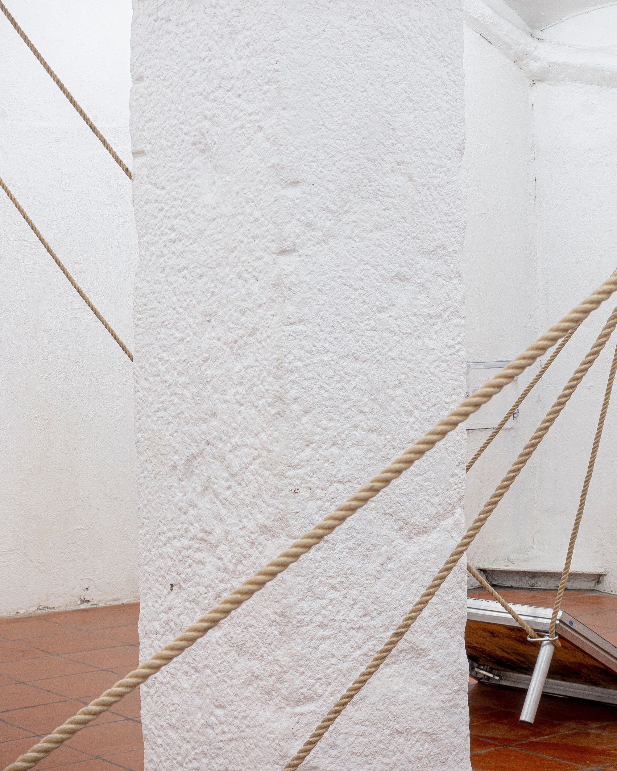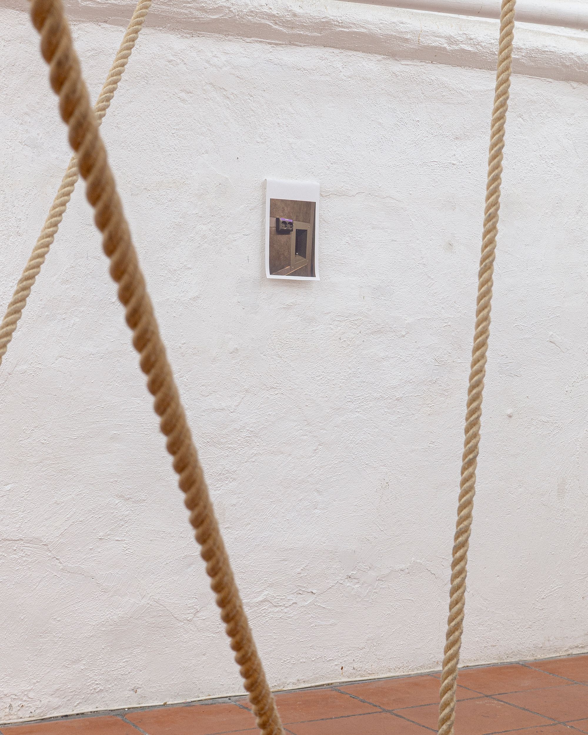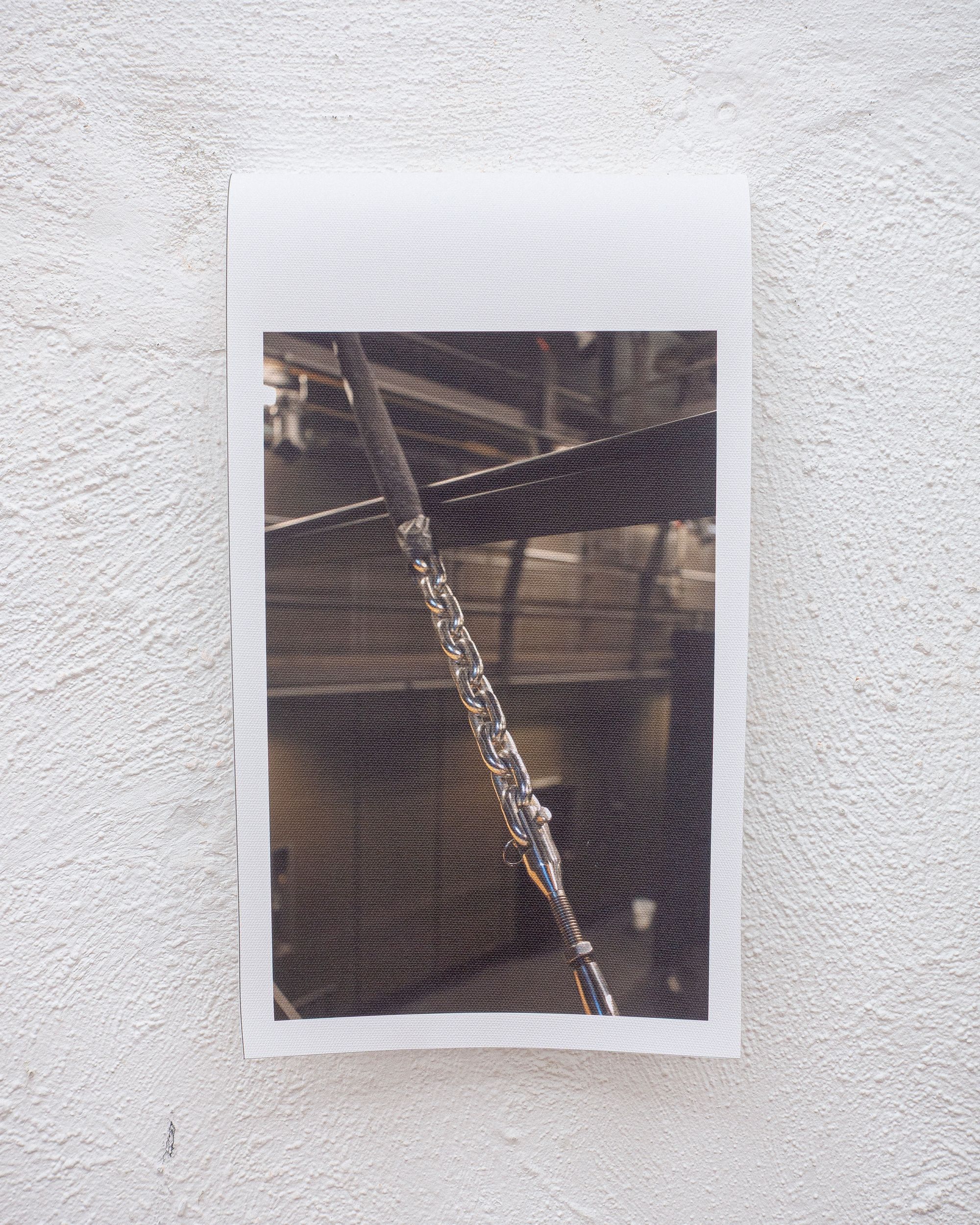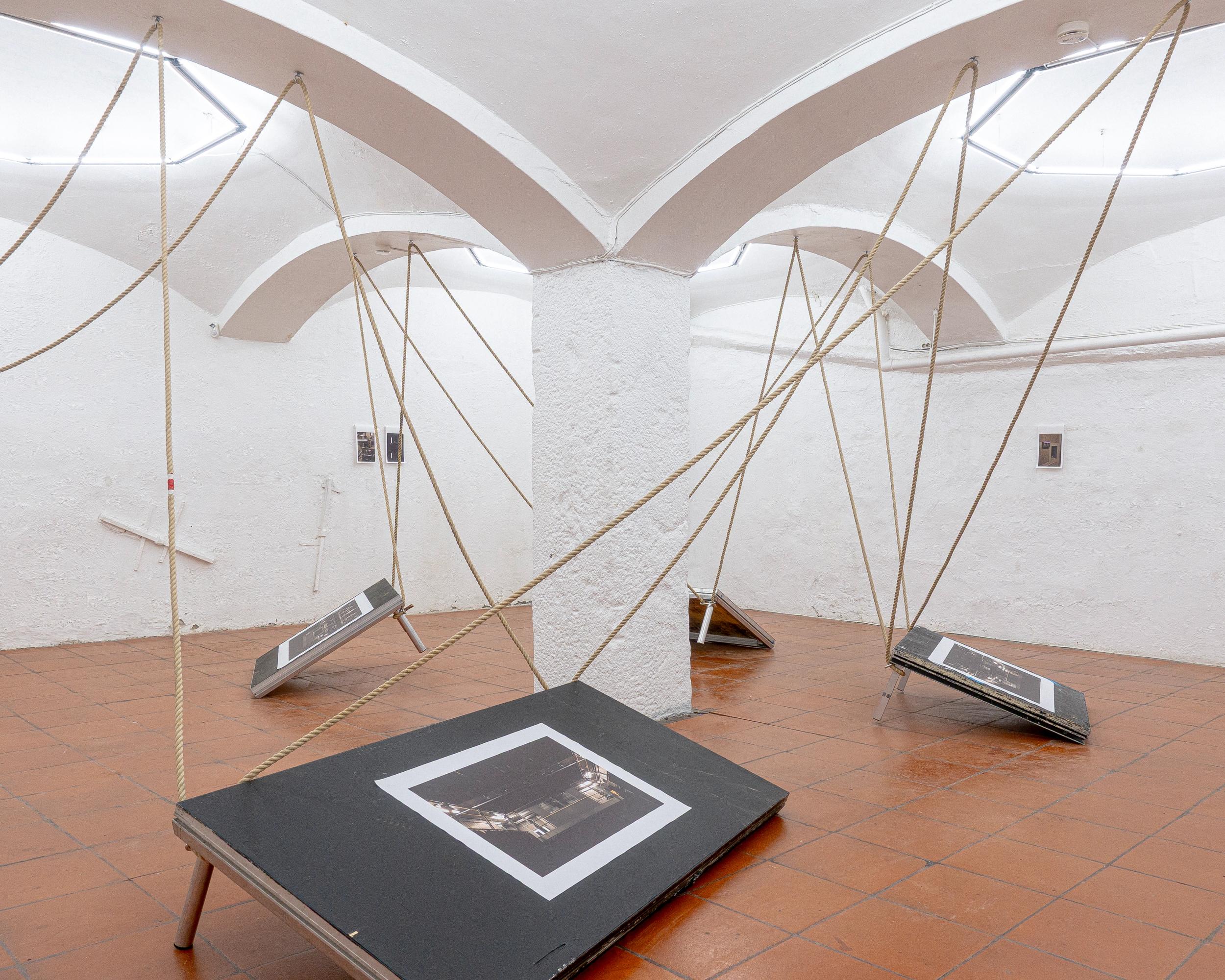 Theatre rope and photographs (inkjet on canvas) on stage elements