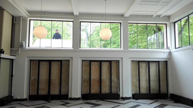 “Nordby repurposed OSB panels that had been used to board up shattered windows on buildings that were damaged after the terrorist bombing of the government district on the 22 July 2011, in Oslo, Norway. These panels were removed from their original site and function, and used to board up windows of the façade at Kunstnernes Hus.